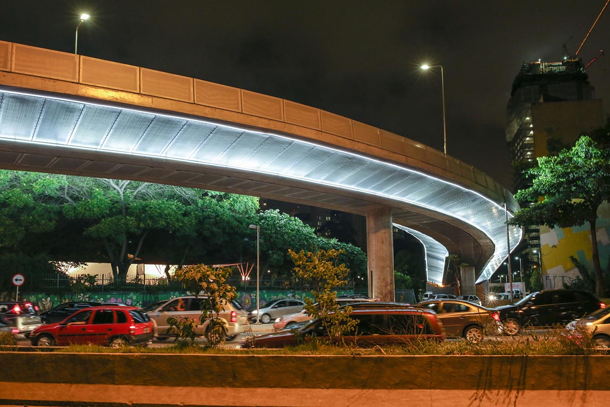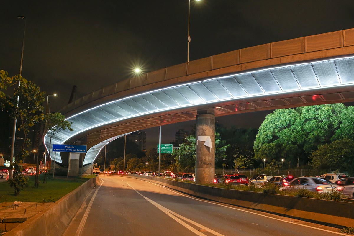 Viaduto JK Marginal Pinheiros.Obra de destaque em frente do Shopping JK na cidade de São Paulo, teve projeto da Empresa Alemã SSF Ingenieure de Munique. Destaca-se a beleza de suas linhas e a iluminação em sua parte inferior, única no Brasil. Viaduto JK Marginal Pinheiros 01 Viaduto JK Marginal Pinheiros 02